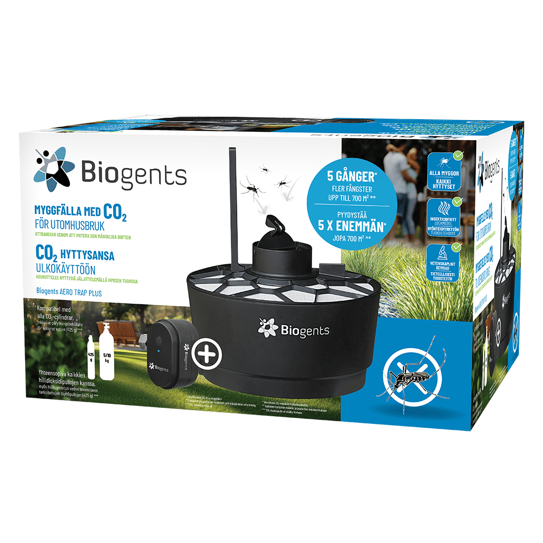 Biogents AERO TRAP PLUS on ulkokäyttöön tarkoitettu hyttysansa, joka houkuttelee hyttysiä ihmisen kaltaisella tuoksulla ja pyydystää ne ennen kuin ne ehtivät pistää ihmistä. Ansa houkuttelee kaikkia hyttyslajeja, ja voit parantaa sen tehoa jopa viisinkertaiseksi Biogents CO2 Control Set -sarjan tuottamalla hiilidioksidilla.